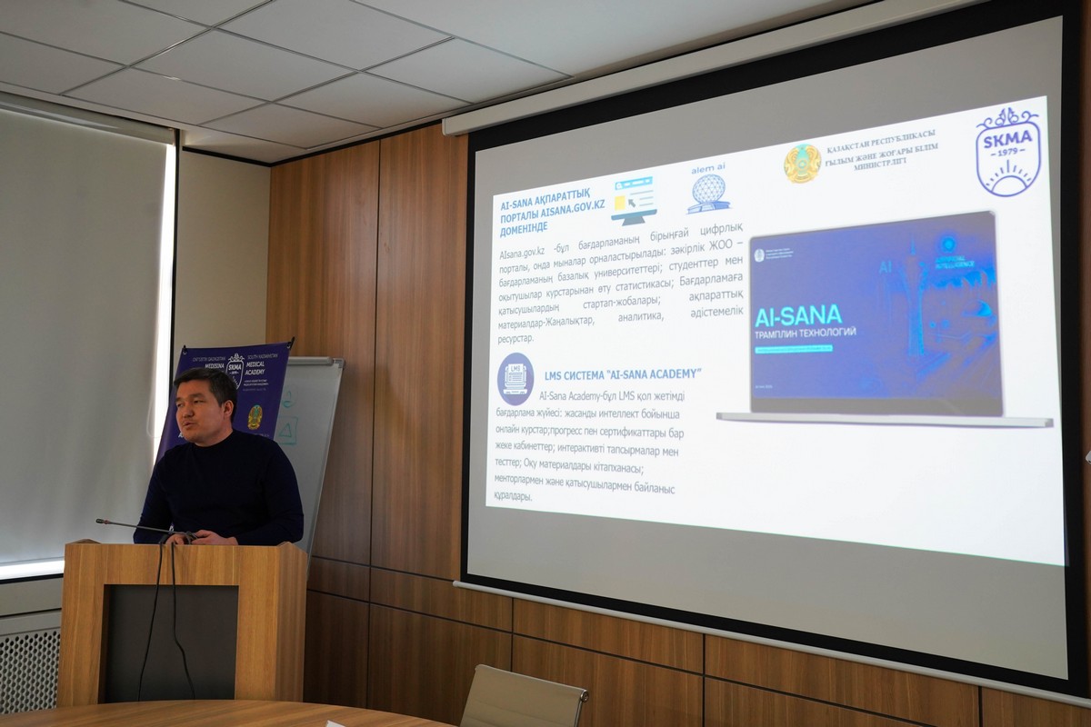 Aibek Senbekovich emphasised the importance of a consistent and phased approach to implementing digital initiatives, highlighting their strategic role in the Academy’s long-term development. He also drew special attention to the growing role of artificial intelligence in the medical field, discussing the effectiveness and prospects of integrating AI technologies into educational processes and clinical practice.